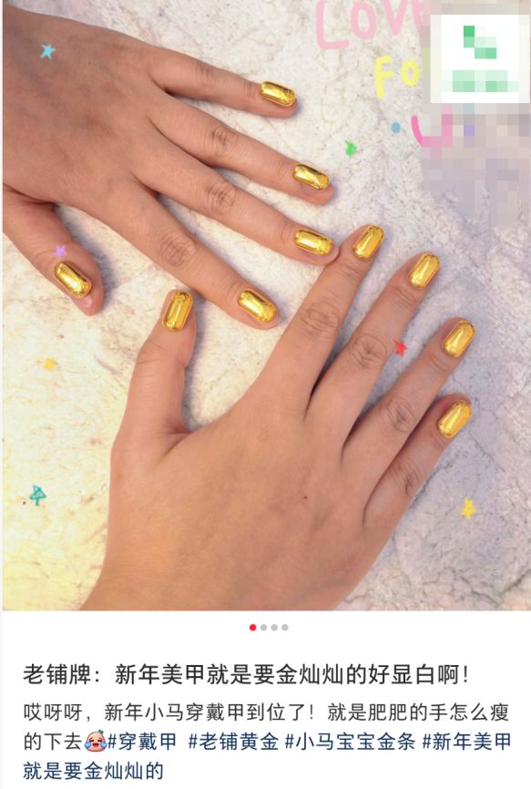 图据小红书 黄金美甲走红伴随着市场两大变化。一是去年以来,国际金价持续走高,一度突破5400美元每盎司,虽近期金价有所回落,但仍维持在5000美元每盎司左右。 二是金饰上市公司业绩却普遍承压。周大福2026财年中报营业额同比下降1.1%,创近5年同期新低,财报期内关店611家;周大生2025年前三季度营收同比下滑37.35%,终端门店数量较2024年同期净减少560家。多个金饰品牌虽也尝试涨价、牵手IP联名、发力线上等。 “美甲打开了黄金作为‘美妆耗材’的新出口,有望让金饰从‘低频高客单’转向‘高频低客单’并破解行业困局。但也有消费者质疑其性价比低、易损耗、无法回收。 当前,消费倾向从从“藏金”转向“戴金”,“小克重”能撬动大市场吗? 黄金美甲走红 有人将10克黄金搬上指甲 2026年春节前夕,林悦(化名)让美甲师将6克多金饰点缀在指甲上,她向记者展示了美甲。“这副‘黄金甲’用了市价近1万元的黄金,是我以前的耳钉、项链,不常戴了,现在做到指甲上,手工费花了1200元。朋友们都说好看,我觉得比买条金项链、戴个金手镯更有仪式感。” 记者在北京、成都等地的多家高端美甲店了解到,当前美甲市场火热,不少店铺忙到傍晚乃至凌晨,除了中国红等款式外,今年和林悦一样用999足金来装扮指尖的人增多。 “我们最近10点上班,凌晨才能下班,有些款式要做6个小时。所以年前不接单了,最快的话可以给你排24号。”在美甲店工作4年的陈丽(化名)告诉记者,其店铺已接待多位来做“黄金甲”的顾客,最近关于这类美甲的咨询量增加了很多。 记者以消费者身份咨询时,成都一家高端美甲店的店员向记者发来了做过黄金美甲的顾客实拍图及视频。据悉,有顾客拿来价值4万元的金饰,让美甲店帮忙切割后做上手,“做她这款的手工费是1360元。”