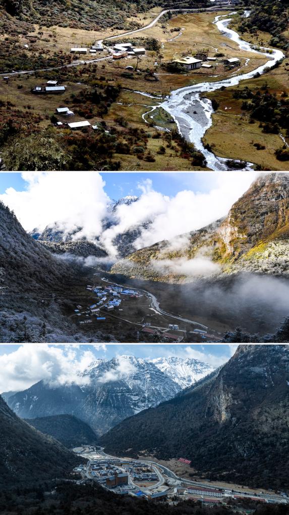拼版照片:上图是2003年10月26日拍摄的玉麦乡(新华社记者索朗罗布摄);中图是2017年10月31日拍摄的玉麦乡(新华社记者普布扎西摄);下图是2026年2月5日拍摄的玉麦乡(无人机照片,新华社记者丁增尼达摄)。 曾经的玉麦,是地图上难寻的 “三人乡”,那时这儿除了两代人默默的坚持外,一无所有。