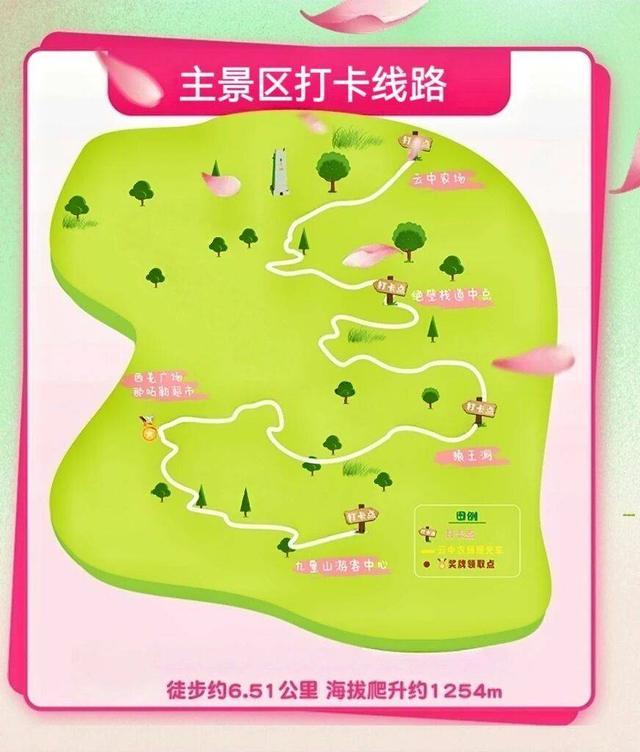 图源:九皇山景区 花溪景・踏春赏花徒步线 在花溪景售票处扫码领取任务,然后徒步上山/坐观光车到达南门,依次徒步打卡3个指定点位,打卡成功即可获得定制奖牌。全程4.2km,爬升高度679m。 打卡线路点位:花溪景游客中心-主观景平台-元宝山