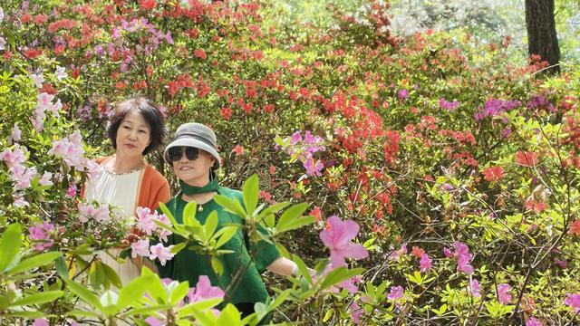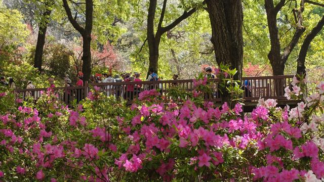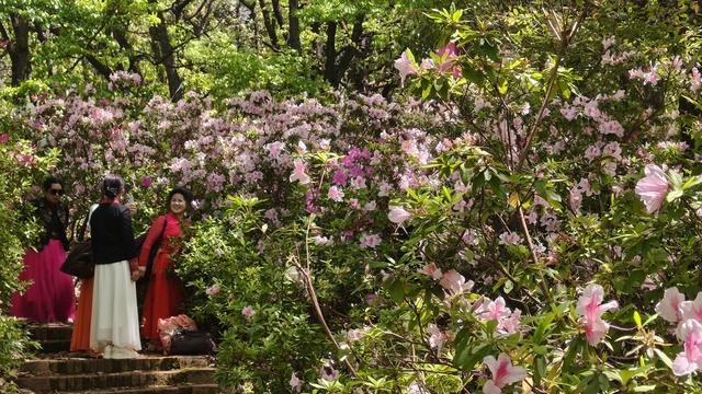 游客们沿步道拾级而上,穿行于花海之间,驻足观赏,拍照留念,尽情享受着人在画中游的诗意与惬意。“每年春天都要来黑龙潭公园看杜鹃,今年的花开得很好,颜色特别美,看着心情都变好了。”一位正在花丛中留影的市民兴奋地说。