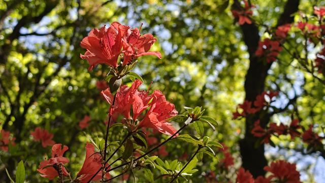 步入公园后山,数百亩杜鹃花正值盛放期,从山脚至半山腰,目光所及之处皆是花的海洋。马缨杜鹃、锦绣杜鹃、毛鹃、映山红等30余个品种的杜鹃花或层叠交错,或簇拥成团,将整片山林染成了一幅色彩斑斓的立体画卷。