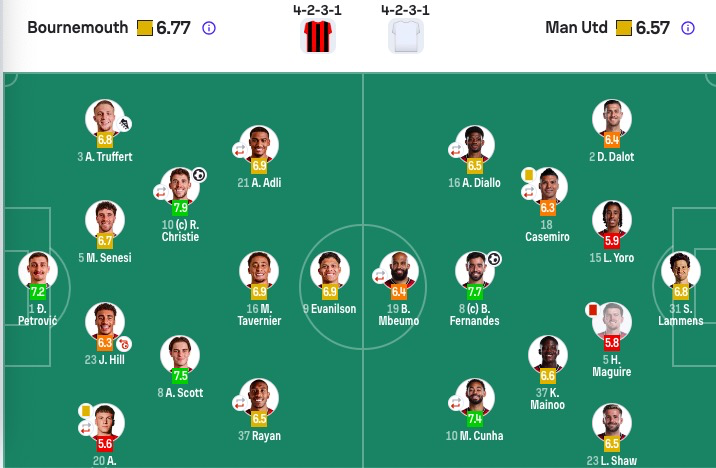 【出场阵容】 曼联首发:31-拉门斯、2-达洛特、15-约罗、5-马奎尔、23-卢克-肖、37-梅努、8-B费、18-卡塞米罗(82'25-乌加特)、16-迪亚洛(96'7-芒特)、10-库尼亚(82'26-海文)、19-姆伯莫(71'30-谢什科) |