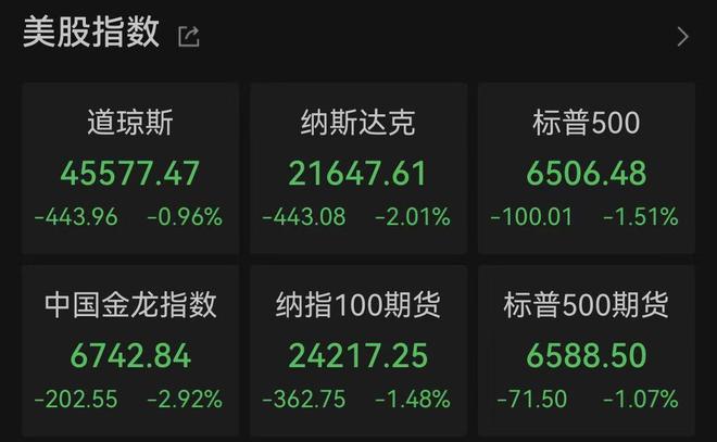 Wind截图 截至收盘,道指跌0.96%报45577.47点,标普500指数跌1.51%报6506.48点,纳指跌2.01%报21647.61点。本周,标普500指数和道指分别下跌1.91%和2.11%,纳斯达克指数下跌2.1%。 板块方面,大型科技股集体下跌,万得美国科技七巨头指数下跌2.03%。个股方面,特斯拉、英伟达跌超3%,谷歌、脸书跌约2%,亚马逊、微软跌超1%,苹果跌0.39%。 能源股多数上涨,埃克森美孚涨超1%,雪佛龙涨0.18%,康菲石油涨0.68%,斯伦贝谢跌超2%,西方石油涨近2%。 航空股全线走低,波音跌近3%,美国航空跌超3%,达美航空跌逾2%,西南航空跌超3%,美联航跌超4%。 芯片股普遍下跌,费城半导体指数跌2.45%,英特尔跌超5%,美光科技跌逾4%,泰瑞达跌超3%,阿斯麦跌逾3%,博通跌近3%,ARM涨超1%。 黄金股全线下跌,盎格鲁黄金跌超5%,金田跌逾4%,金罗斯黄金跌超3%,科尔黛伦矿业跌逾3%,泛美白银跌超3%,巴里克黄金跌超3%。 中概股普遍下跌,纳斯达克中国金龙指数跌2.92%,万得中概科技龙头指数跌2.48%。个股方面,金山云跌超9%,小鹏汽车跌逾8%,蔚来跌超7%,万国数据跌逾7%,陆控跌近7%,涂鸦智能涨超7%,奇富科技涨逾1%,BOSS直聘涨超1%。 此外,霍尔木兹海峡原油运输受阻,市场担忧原油供应短缺,叠加投机资金增持布伦特原油净多头头寸,共同推动油价上涨。美油主力合约收涨2.66%,报98.09美元/桶,周涨0.12%;布油主力合约涨3.2%,报107.1美元/桶,周涨7.96%。 国际贵金属期货普遍收跌,COMEX黄金期货跌2.47%报4492.00美元/盎司,本周累计跌11.26%;COMEX白银期货跌4.78%报67.81美元/盎司,本周累计跌16.64%。(中新经纬APP) |