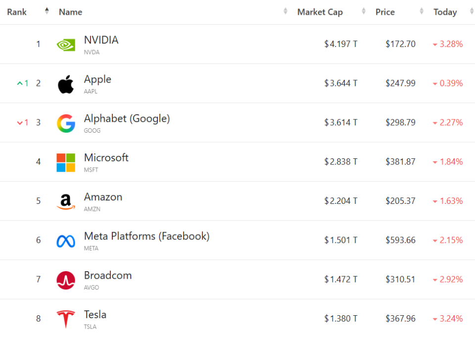 B. Riley首席市场策略师Art Hogan表示:“在目前充满不确定性的环境下,任何指数出现10%的回调都并不罕见。标普500指数由于其涵盖范围更广、成分股更多元化,跌幅要小一些。但这同时也表明,我们正处于一个非常不确定的时期。” 热门股表现 “七巨头”集体下跌,(按市值排列)英伟达跌3.28%,苹果跌0.39%,谷歌C跌2.27%,微软跌1.84%,亚马逊跌1.63%,Meta跌2.15%,特斯拉跌3.24%。