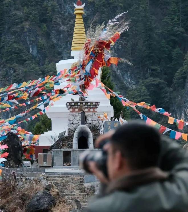 天然佛塔正面黄金位 雪山为伴、经幡为景,是巴拉格宗最具神圣感的机位。在这里可以捕捉日照金山、云雾绕塔的绝美画面,远景是巍峨雪山,近景是飘动经幡,构图大气庄重,自带庄严氛围感。