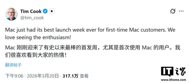 IT之家 3 月 21 日消息,苹果首席执行官蒂姆 · 库克昨日(3 月 20 日)在 X 平台发布推文,表示 2026 款 MacBook 机型刷新了苹果公司面向首次购机用户的“史上最佳首周销售纪录”。